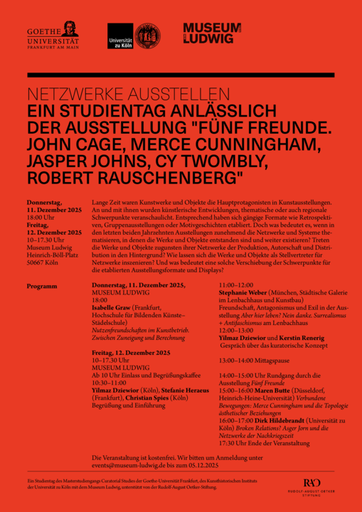 Anlässlich der Ausstellung „Fünf Freunde. John Cage, Merce Cunningham, Jasper Johns, Robert Rauschenberg, Cy Twombly“ findet im Museum Ludwig ein zweitägiger Studientag zum Thema „Netzwerke ausstellen“ statt. Die Veranstaltung wird vom Kunsthistorischen Institut der Universität zu Köln und dem Studiengang Curatorial Studies der Goethe-Universität/Städelschule Frankfurt in Kooperation mit der Abteilung Medien- und Kulturwissenschaft der HHU Düsseldorf (Prof. Dr. Maren Butte) organisiert und veranstaltet.